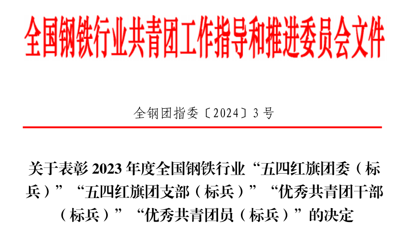 全国钢铁行业共青团工作指导和推进委员会下发了《关于表彰2023年度全国钢铁行业“五四红旗团委(标兵)”“五四红旗团支部(标兵)”“优秀共青团干部(标兵)”“优秀共青团员(标兵)”的决定》,6776永利集团团总支被授予“全国钢铁行业‘五四红旗团支部’”荣誉称号。