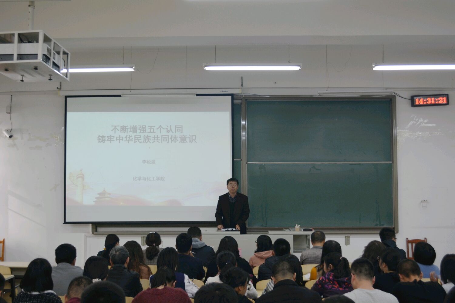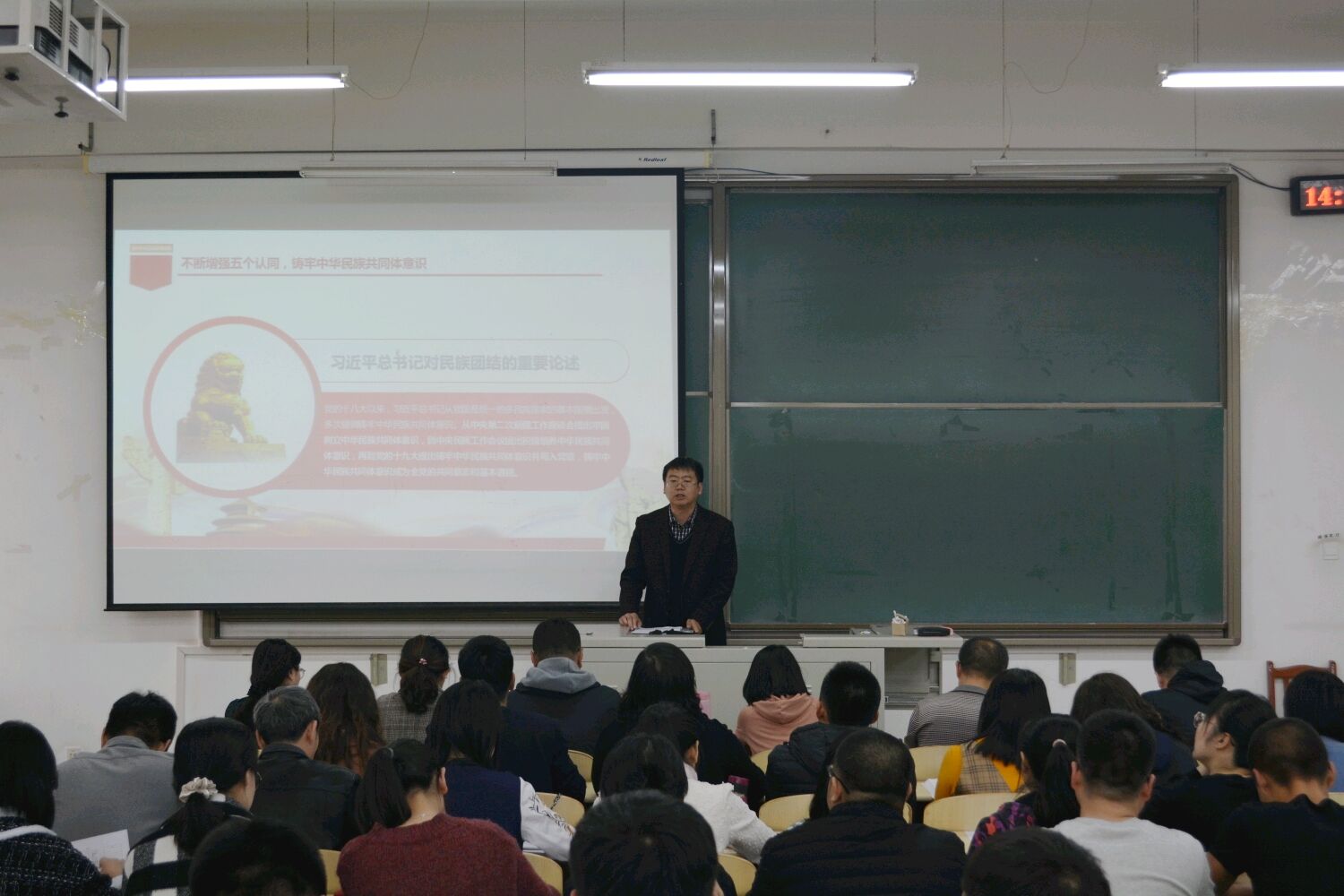 课上,李松波书记从“铸牢中华民族共同体意识的前提、首要任务、核心、实践途径和铸牢中华民族共同体意识的关键”五个方面展开讲解。教育广大师生要贯彻落实习近平总书记关于“铸牢中华民族共同体意识”重要论述,全面贯彻党的民族理论和民族政策,坚持共同团结奋斗、共同繁荣发展,促进各民族像石榴籽一样紧紧拥抱在一起,推动中华民族走向包容性更强、凝聚力更大的命运共同体。教育广大师生要进一步增强“四个意识”,坚定“四个自信”,做到“两个维护”,真正从全局和战略高度理解和把握铸牢中华民族共同体意识的重大意义,不断增强铸牢中华民族共同体意识的历史自觉和政治自觉。