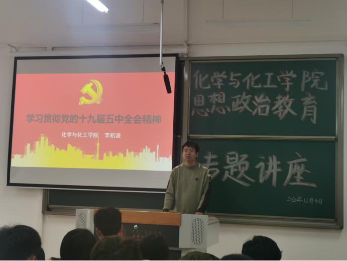 2020年12月4日,6776永利集团在明德楼H108开展思想政治理论课专题讲座。本次讲座主题为:学习贯彻党的十九届五中全会精神,主讲人:化学与化工公司党总支书记李松波。