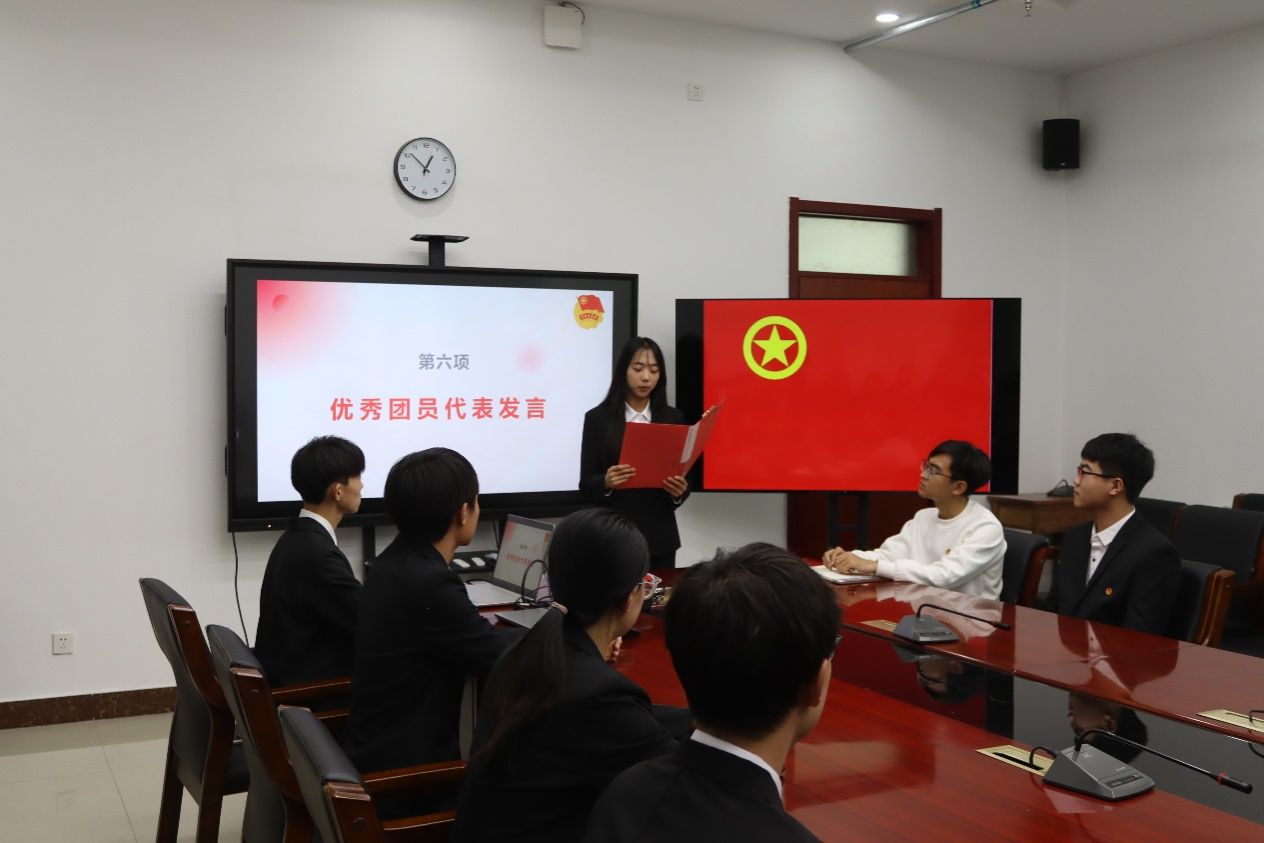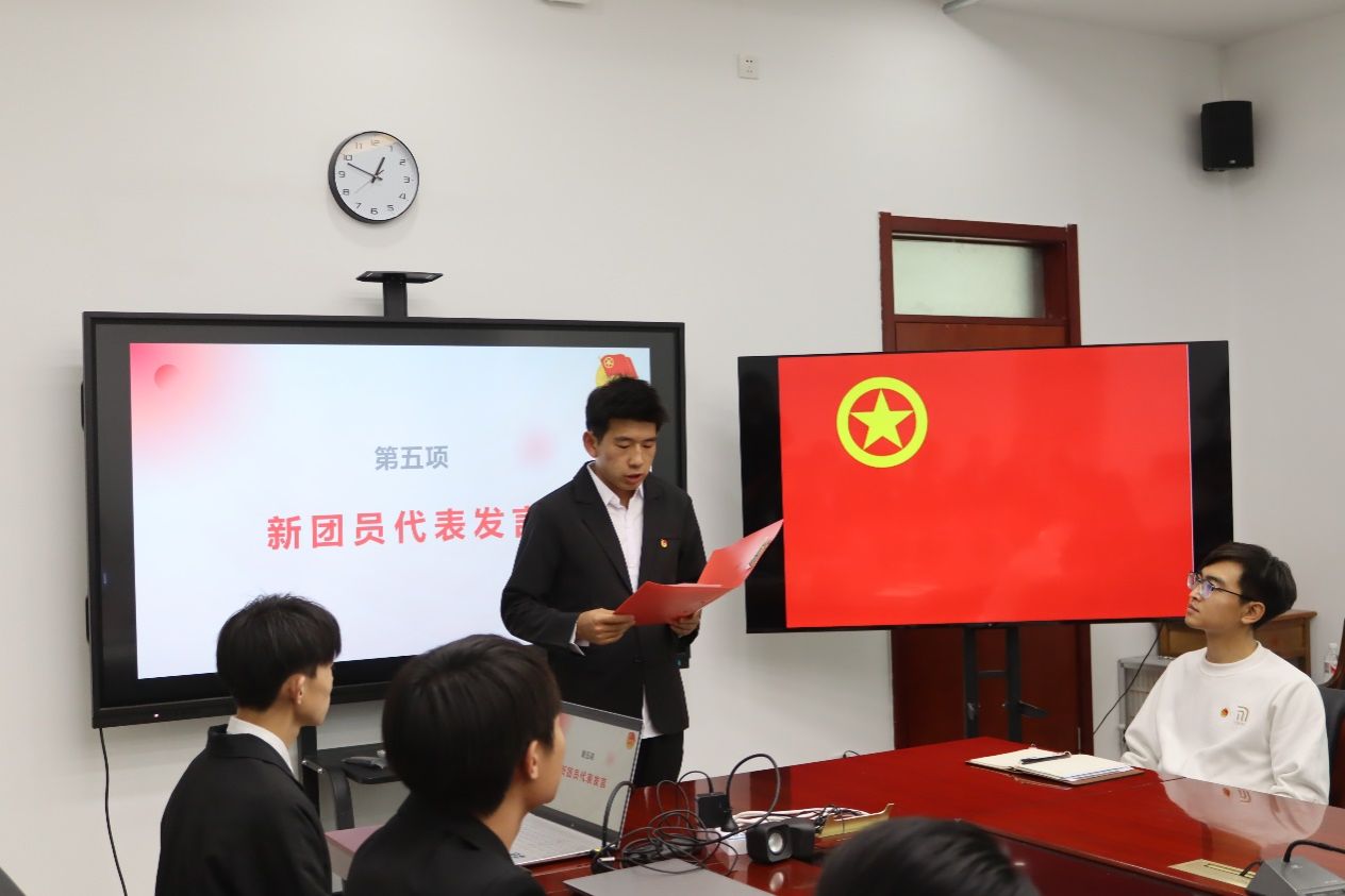 郭长峥同学作为新团员代表发言,呼吁新团员们要严格遵守团的章程,履行团员义务,不负韶华,以更积极昂扬的姿态投入到学习生活之中。张巾帼作为优秀团员代表发言,她说,青年团员应当不断提升自己的综合素质和能力水平,在学习和生活中起到模范带头作用,将团员身份当作一份责任与担当。辅导员包长江老师要求各位团员应牢记誓词,坚定理想信念,鼓励全体团员志存高远,努力提升自身的学习能力,为国家发展与中华民族的伟大复兴贡献自己的青春力量。