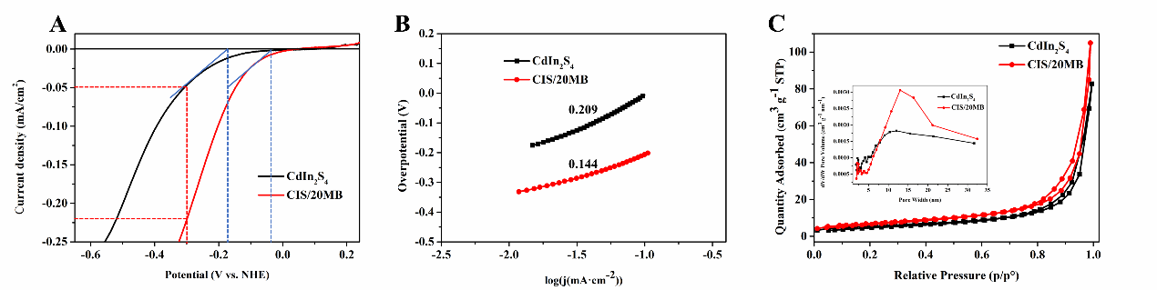 研究表明,CdIn2S4/MoB异质结光催化剂有优异而稳定的活性,最佳复合物的产氢活性高达463.53μmol⋅g-1⋅h-1,相比于CdIn2S4-1%Pt活性明显提高。在紫外光电子测试中,CdIn2S4/MoB复合材料的费米能级与CdIn2S4和MoB相比发生了一定的位移,表现为费米能级的重排和Schottky异质结的形成。形成的肖特基异质结极大地促进了电子从CdIn2S4向MoB的迁移(经XPS测试证实),从而获得了较高的电荷分离效率(被一系列电化学和光致发光结果证实)。最后,总结活性明显提高不仅是由于电荷重分配诱导形成了肖特基异质结,导致了高效的载流子分离,而且还由于MoB增加了复合材料的析氢位点,在动力学上加速了H2的释放。