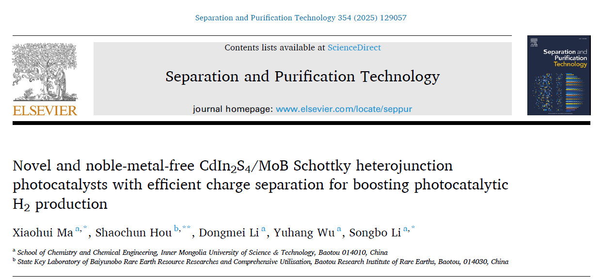 近日,公司马晓辉博士在国际TOP期刊Separation and Purification Technology上发表题为“Novel and noble-metal-free CdIn2S4/MoB Schottky heterojunction photocatalysts with efficient charge separation for boosting photocatalytic H2production”(Sep. Purif. Technol. 354 (2025) 129057)的重要研究成果。马晓辉博士为该论文第一作者兼通讯作者,公司李松波教授和包头稀土院侯少春所长为共同通讯作者,6776永利集团为本论文的第一完成单位。